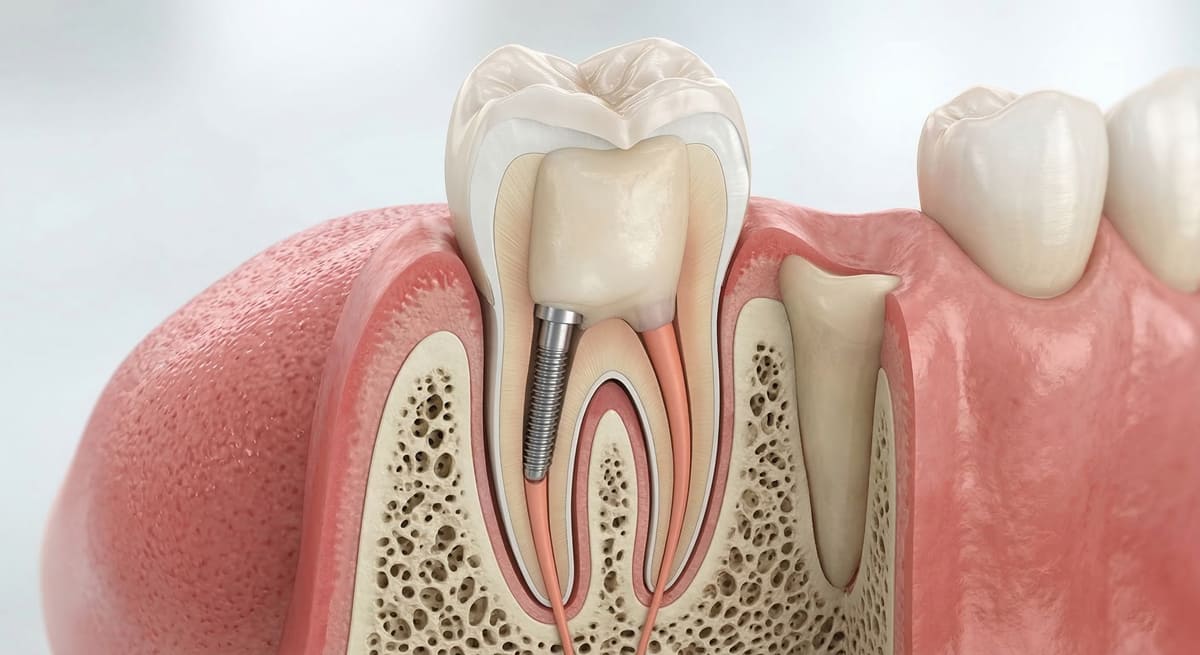Sometimes a core build up on its own may not give sufficient support for the crown. In this case, a post may be used to help anchor the core material to the tooth. This is accomplished by drilling an access space for the post, usually in alignment with one of the root canals that was sealed during root canal therapy. A post matching the size of the access space is placed and bonded in place. Next, dental core material is placed around the post. The dental core is then anchored by both the post and the surrounding tooth structure.